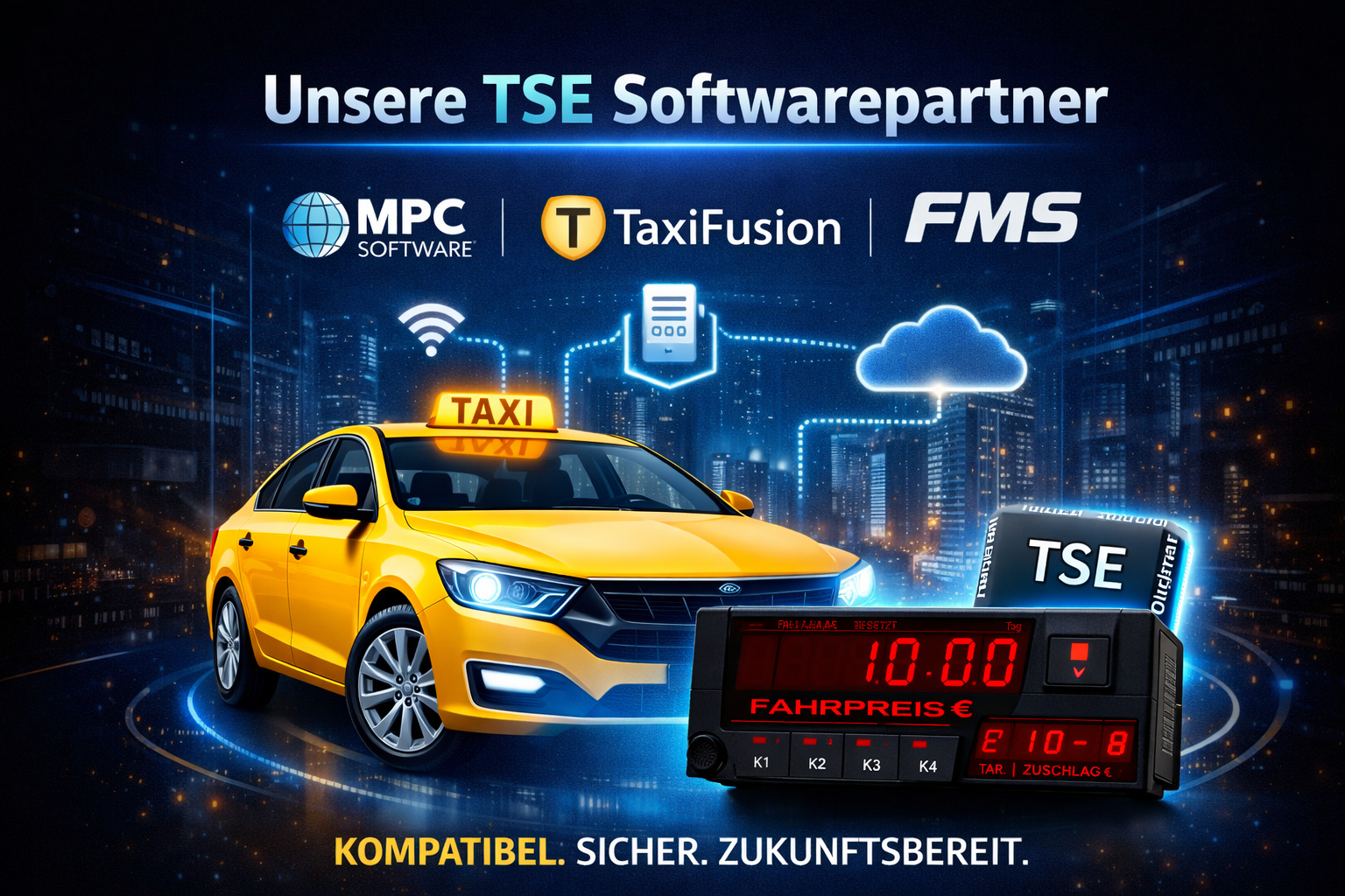 Entdecken Sie unsere Softwarepartner für nahtlose Abläufe zwischen Taxameter, Betrieb und Abrechnung. Von direkter Auftragsvermittlung im Fahrzeug bis hin zu zentraler TSE-Archivierung und cloudbasierten Lösungen – wir zeigen Ihnen die passenden Systeme für einen zukunftssicheren und effizienten Arbeitsalltag.